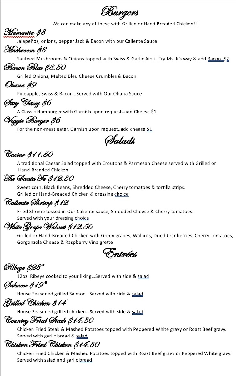 K's Place also serves comforting entrées such as Chicken Tenders and the classic Chicken Fried Steak, ideal for a filling and flavorful meal.