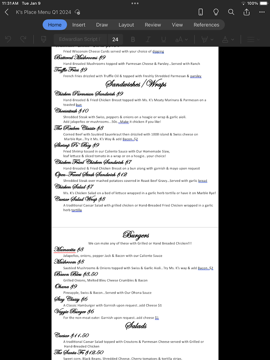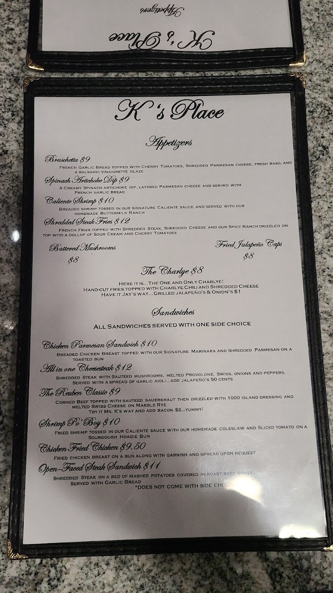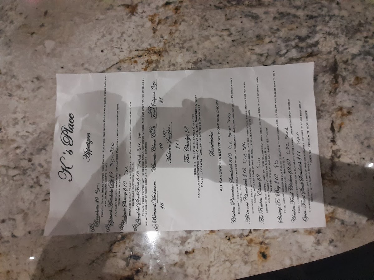 Whether you're stopping by for a quick bite or enjoying a full meal with family or friends, K's Place offers a menu packed with variety, great flavors, and something for everyone at an affordable price.